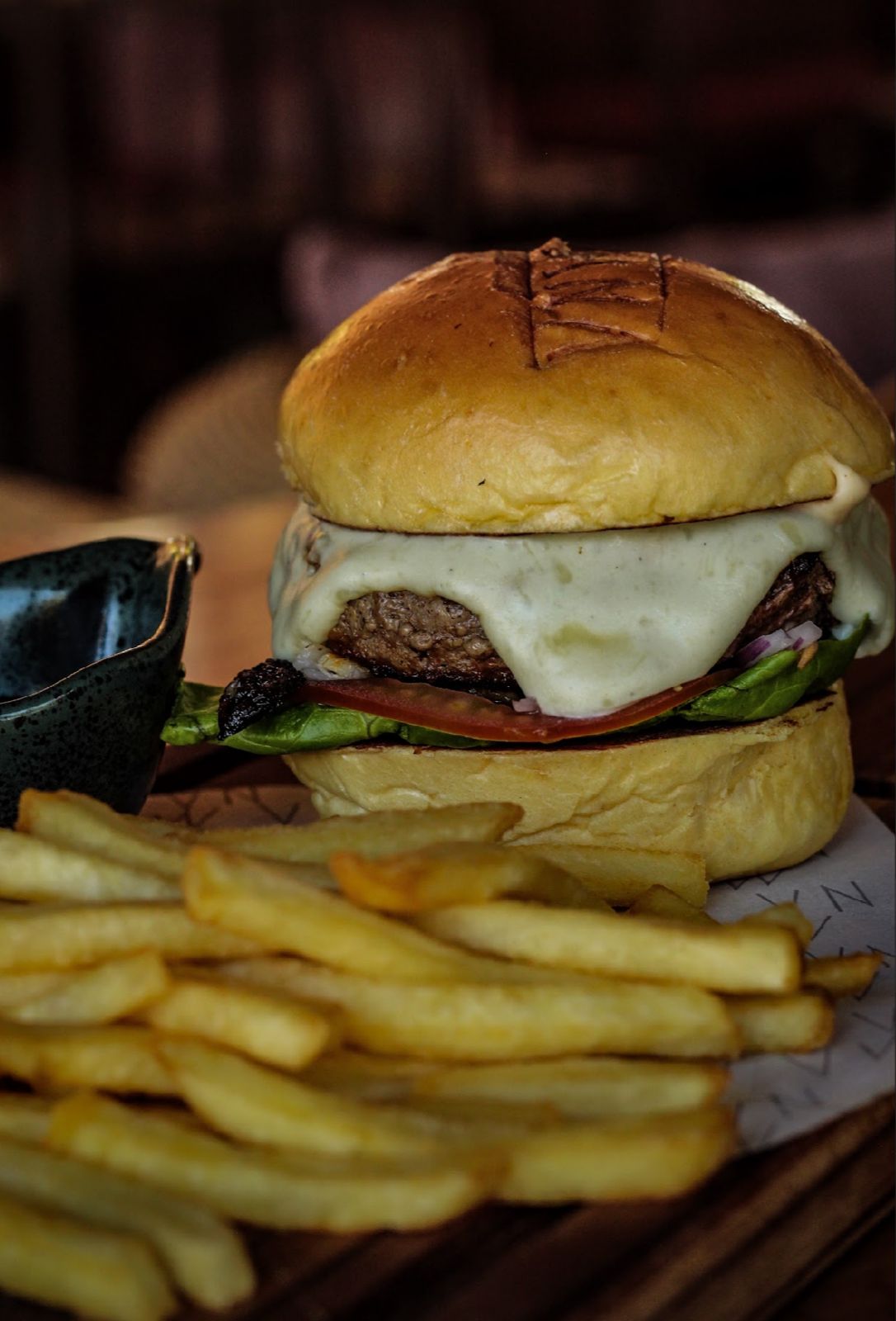 Suculento burguer de carne Angus, com cremoso creme de gorgonzola artesanal, acompanhado de batatas fritas.