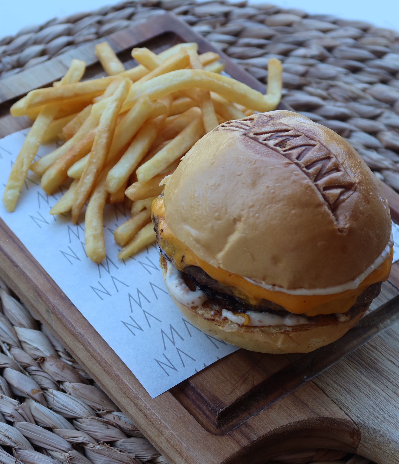 Burguer de carne bovina Angus, com queijo, bacon e cebola caramelizada, acompanhado de batata frita.