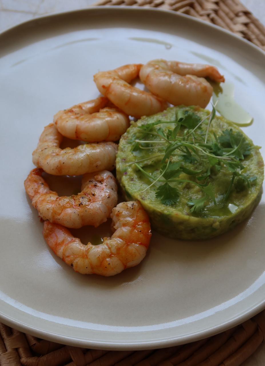 Camarões grelhados, acompanhados de guacamole cremoso de abacate, limão e coentro, finalizados com chips artesanais crocantes de batata-doce.