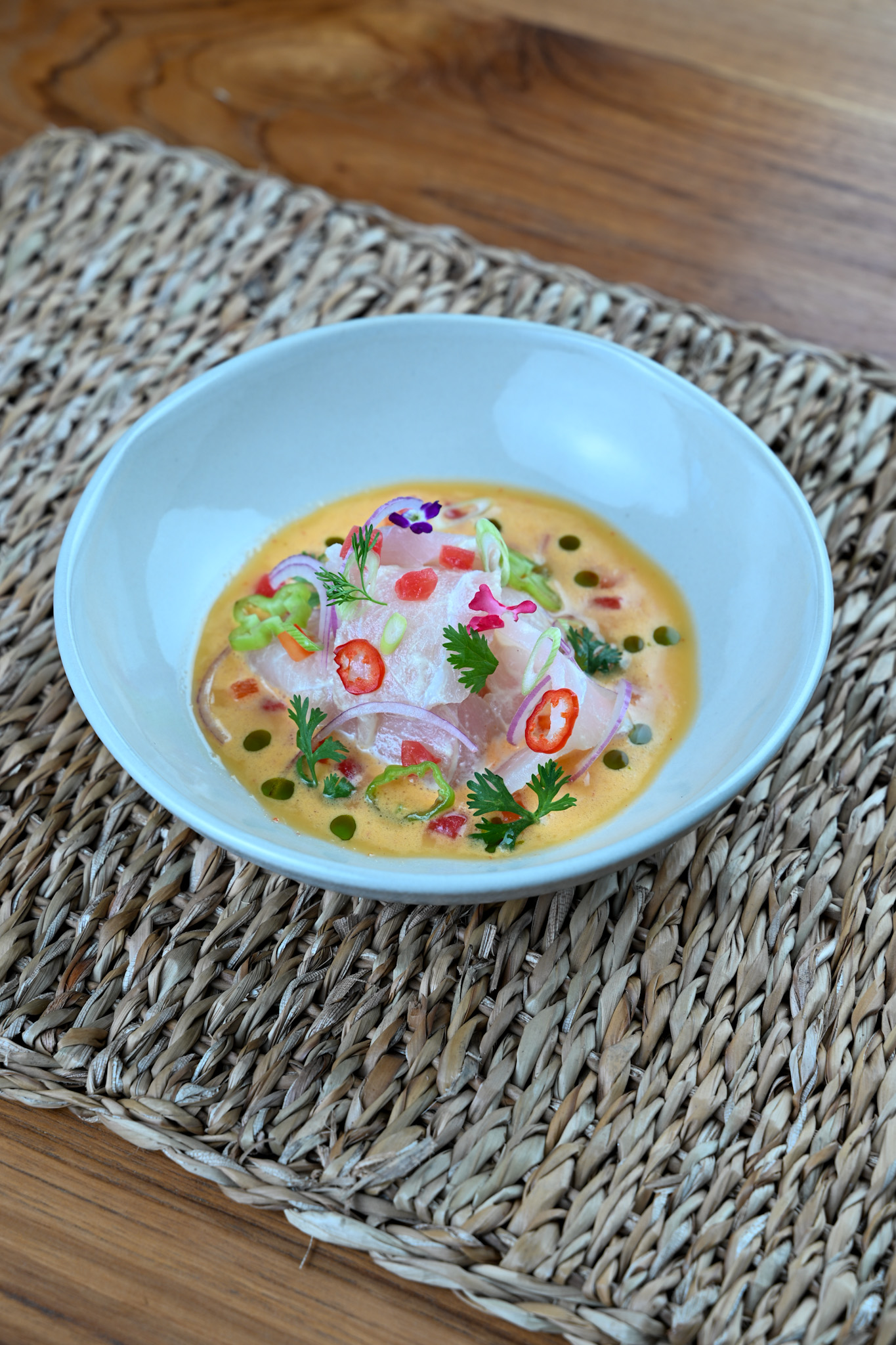 Peixe fresco curado no leite de tigre, intenso e aromático, com notas cítricas e leve picância.