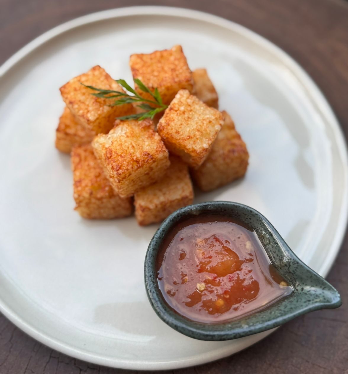 Deliciosos dadinhos de tapioca, dourados até ficarem crocantes por fora e cremosos por dentro, servidos com geleia de pimenta, que adiciona um contraste agridoce e levemente picante ao prato.